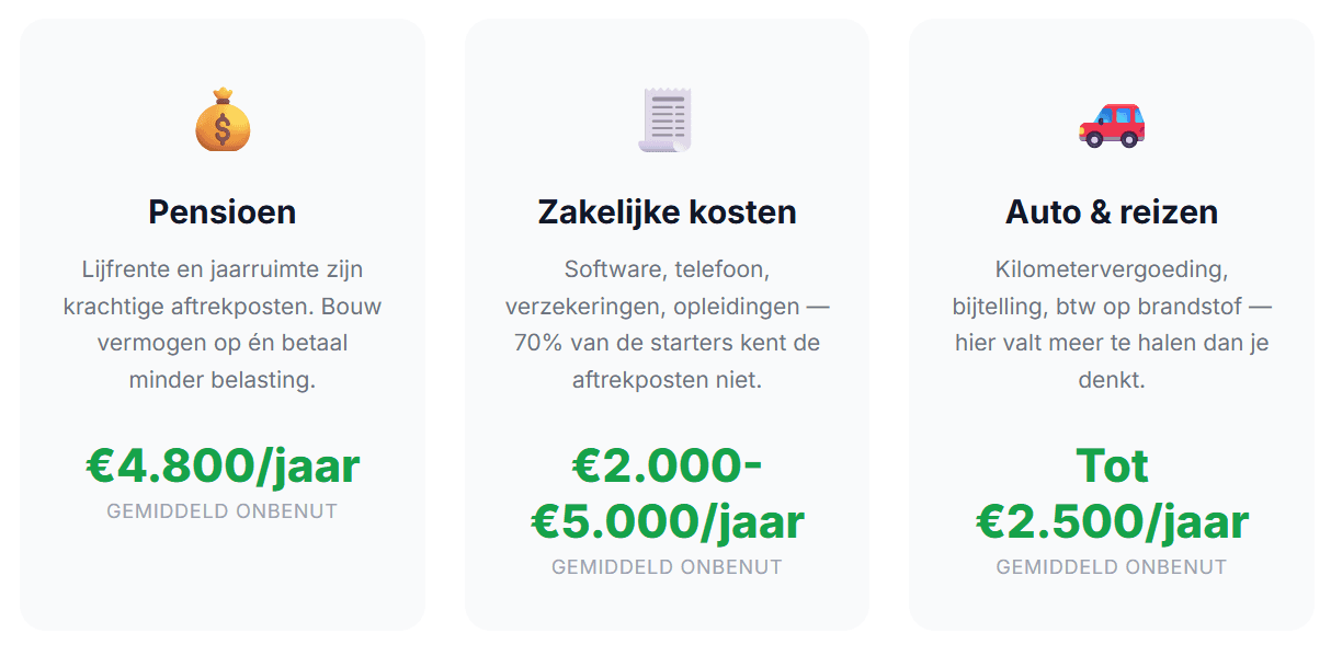 Zelfstandigenaftrek, startersaftrek, hypotheek, pensioen, auto...